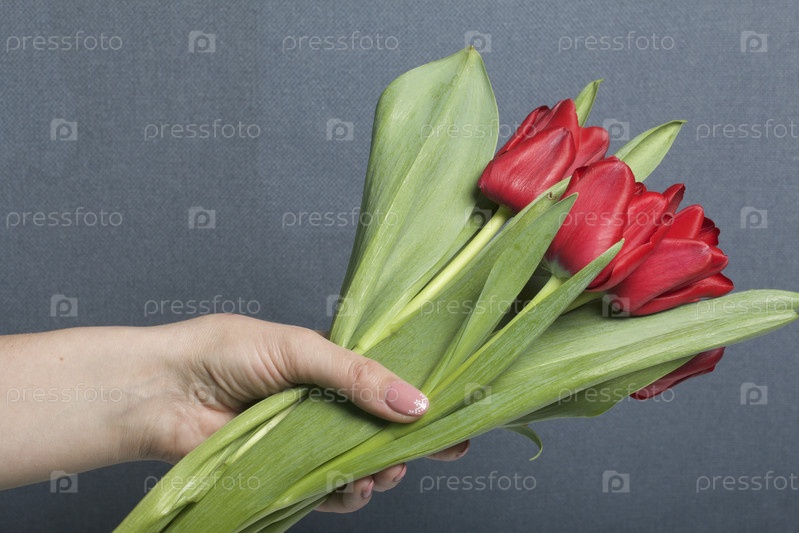 Девушка держит букет красных тюльпанов
