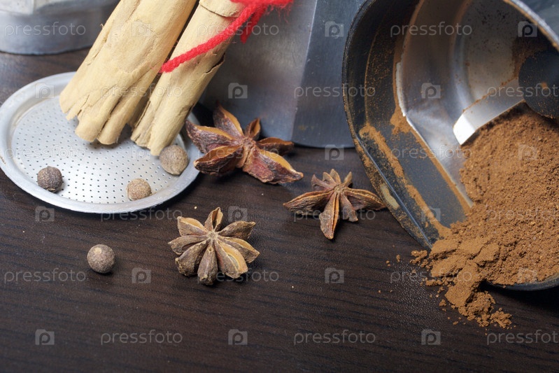 Гейзерная кофеварка в разобранном виде, кофе и специи