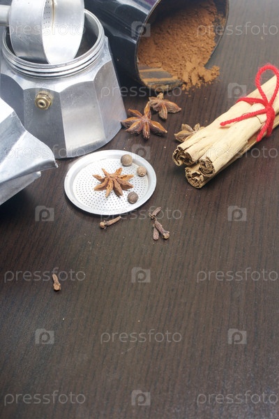 Гейзерная кофеварка в разобранном виде, кофе и специи