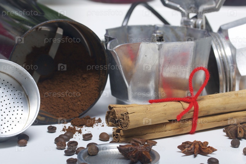 Гейзерная кофеварка в разобранном виде, кофе и специи