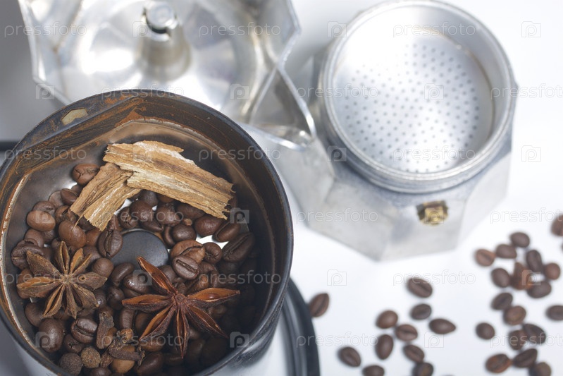 Гейзерная кофеварка в разобранном виде, кофе и специи