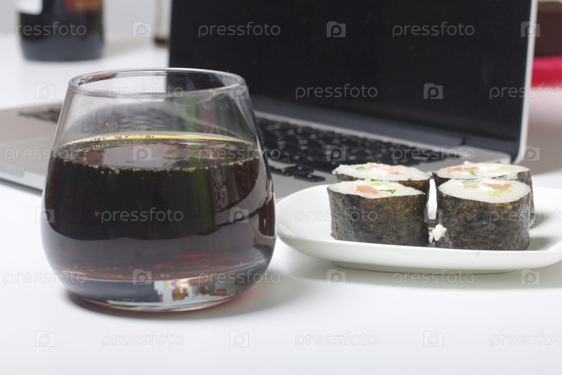 Пиво и суши с ноутбуком