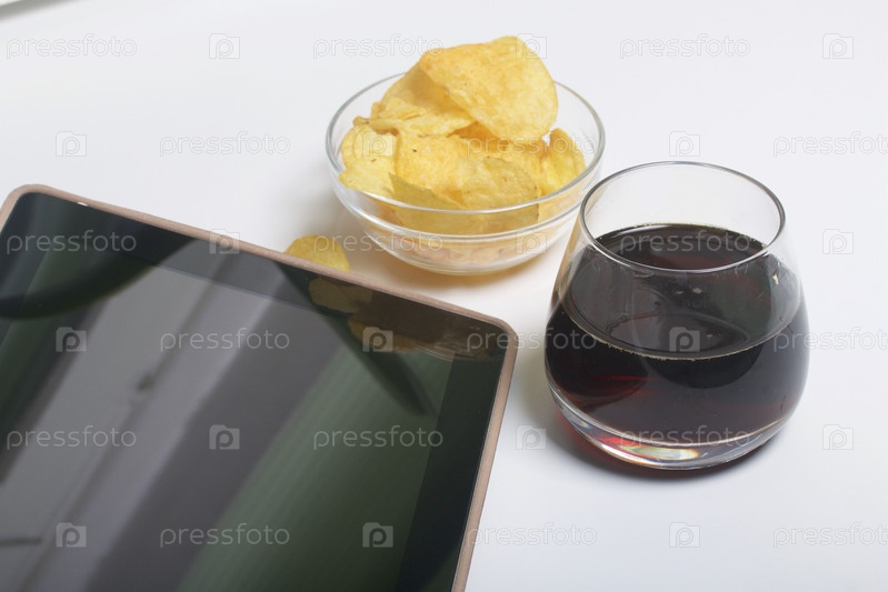 Пиво и чипсы с планшетом. Отдых выходного дня