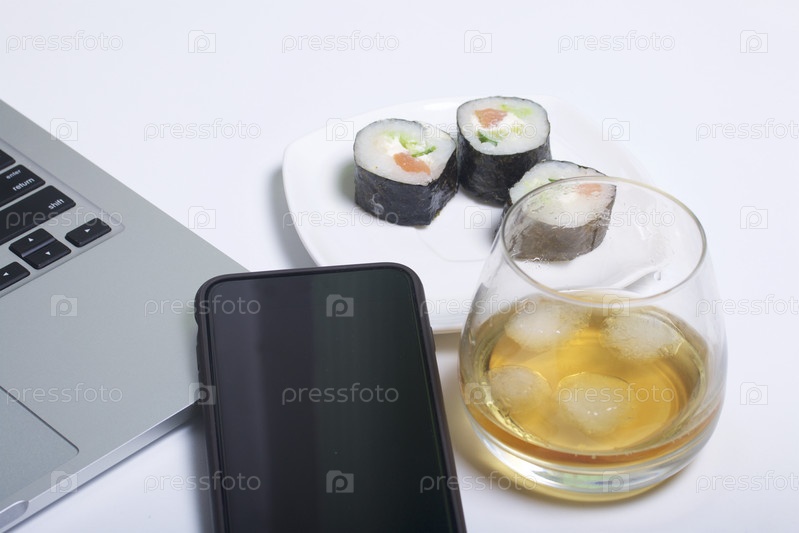 Виски со льдом, суши, ноутбук и смартфон. Отдых выходного дня