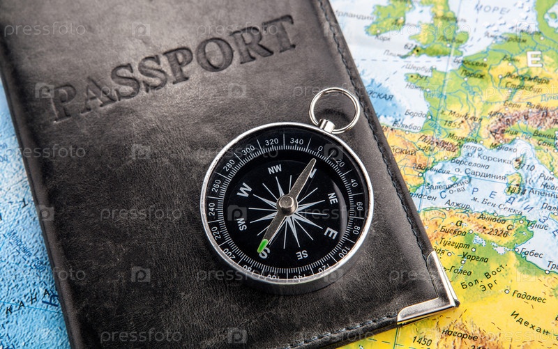 Компас, паспорт в обложке и карта мира