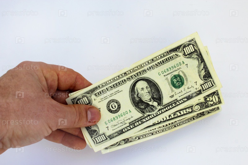 Рука с долларами США на белом фоне