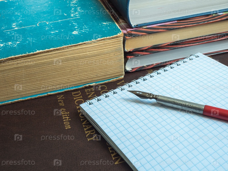Старая ручка лежит на открытой записной книжке