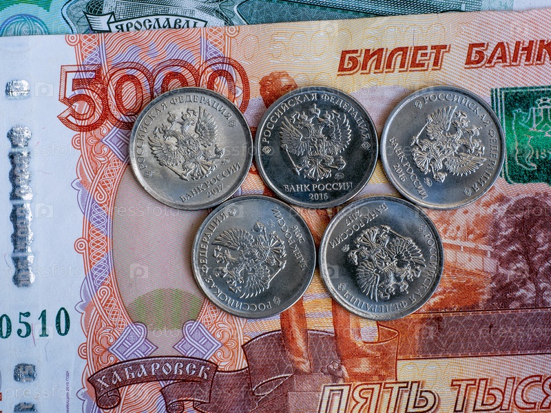Пять российских монет лежат на банкноте