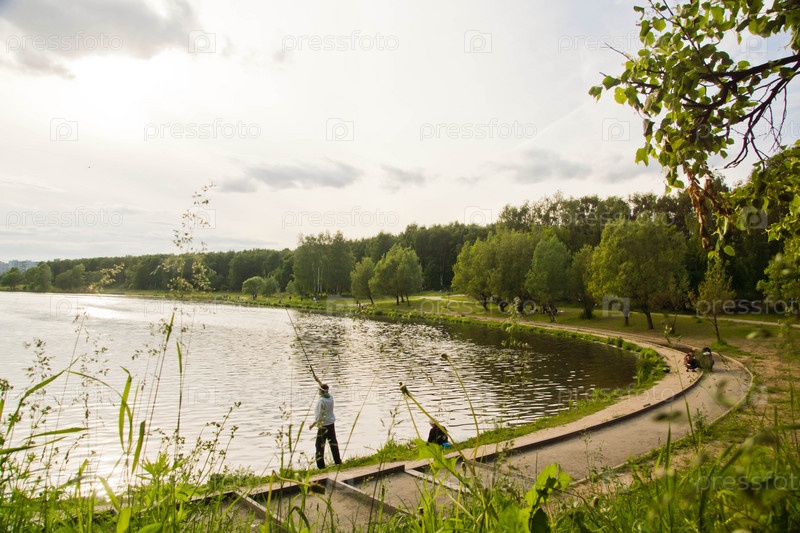 Рыбаки на берегу пруда в летний день