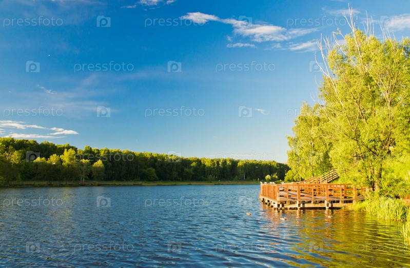 Деревянный пирс на пруду летом