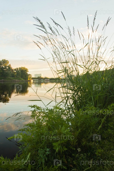 Трава на берегу пруда в летний вечер