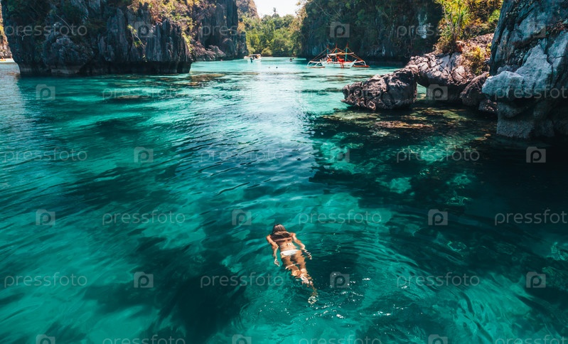 Женщина плавает в чистой морской воде в Азии