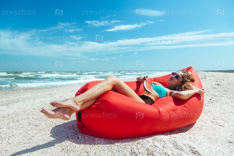Девушка отдыхает на пляже с арбузом