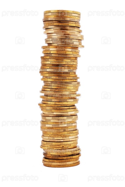 Стопка золотых монет на белом фоне