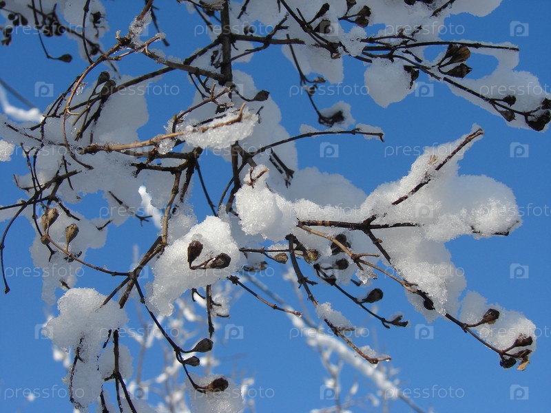 Ветка в снегу на фоне голубого неба