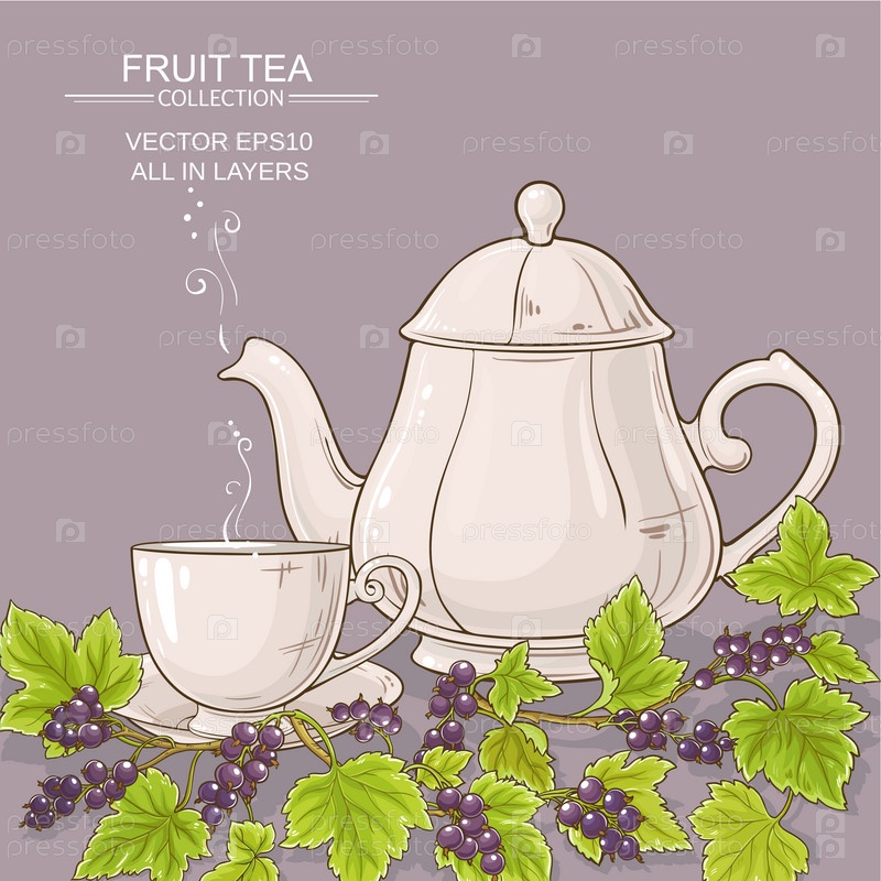 Чай с черной смородиной и чайник на цветном фоне