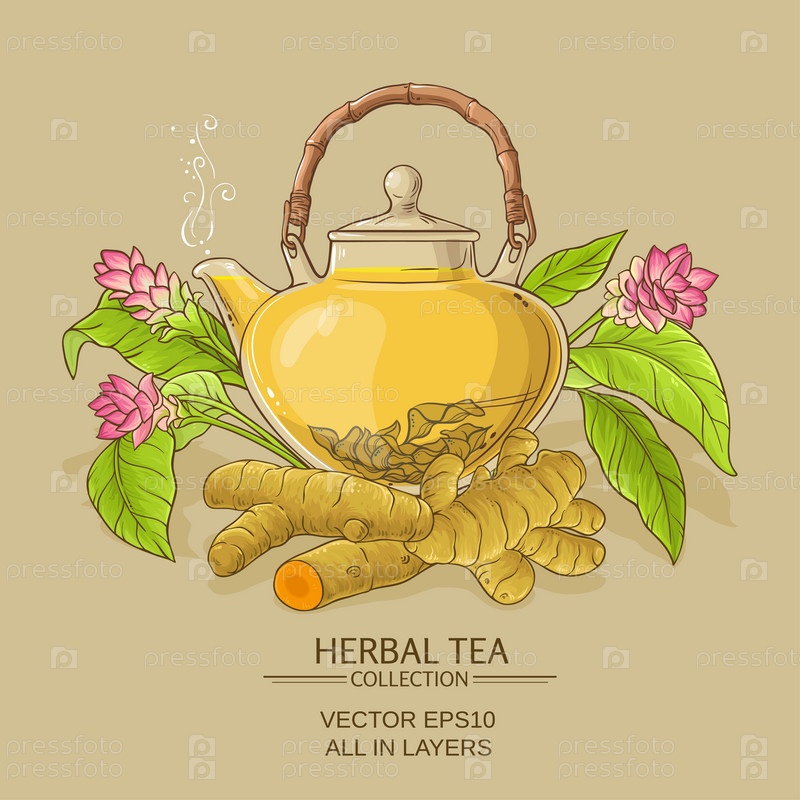 Куркума и чай в чайнике на цветном фоне