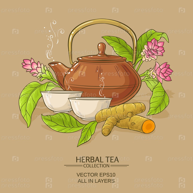 Куркума и чай в чайнике на цветном фоне