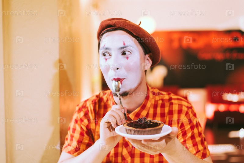 Клоун ест торт в кафе