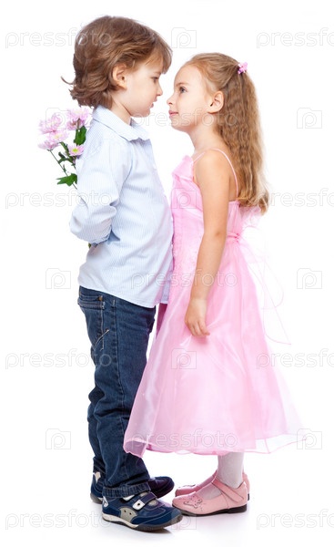 Мальчик прячет за спиной цветы для девочки