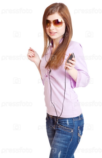 Молодая девушка с плеером на белом фоне
