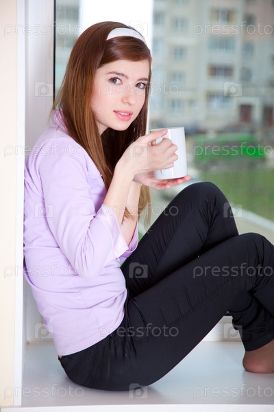 Девушка пьет кофе сидя у окна