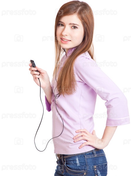 Девушка слушает музыку на белом фоне