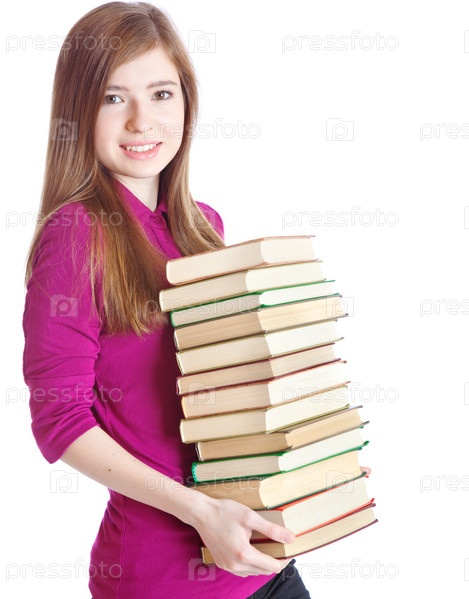 Девушка со стопкой книг на белом фоне