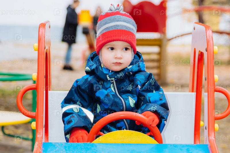 Ребенок сидит за рулем детского автомобиля на детской площадке
