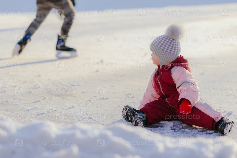 Маленький ребенок сидит на снегу на закате