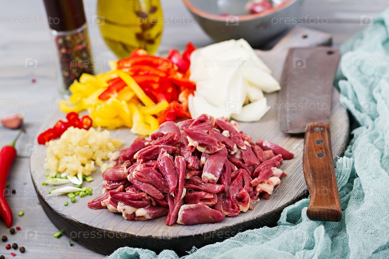 Ингредиенты для приготовления жаркого из куриных сердец, красного перца и лука
