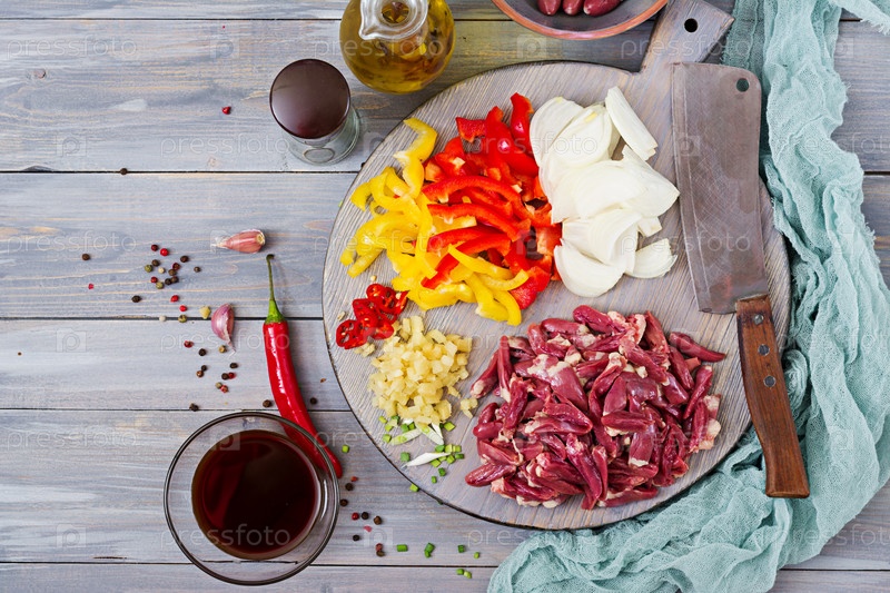 Ингредиенты для приготовления жаркого из куриных сердец, красного перца и лука