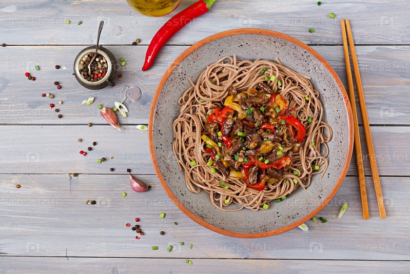Жаркое из куриных сердец, красного перца, лука и гречневой лапши. Вид сверху