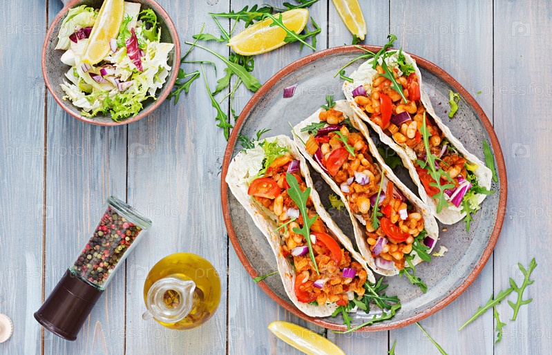 Мексиканские тако с говядиной, фасолью в томатном соусе с сальсой