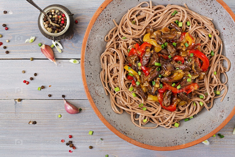 Жаркое из куриных сердец, красного перца, лука и гречневой лапши. Вид сверху
