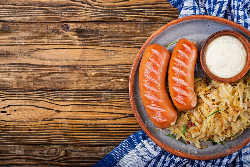 Тарелка колбасы и квашеной капусты. Традиционный Октоберфест