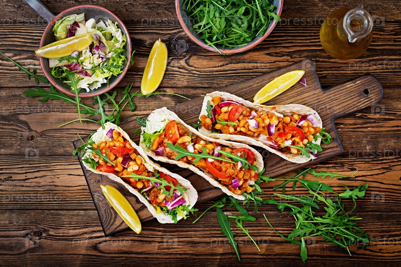 Мексиканские тако с говядиной, фасолью в томатном соусе с сальсой