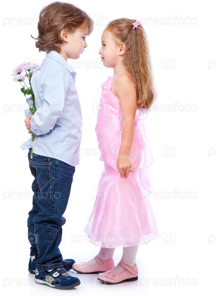 Мальчик с цветами и девочка на белом фоне