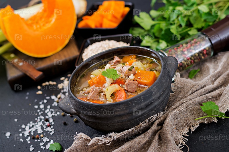 Густой суп с телятиной, перловкой, тыквой и сельдереем. Диетическое меню