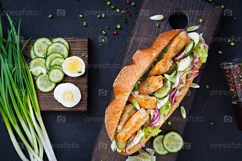 Багет-бутерброд с рыбой, яйцом, маринованным луком и листьями салата. Вид сверху