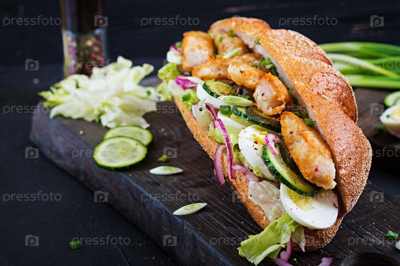 Багет-бутерброд с рыбой, яйцом, маринованным луком и листьями салата. Вид сверху
