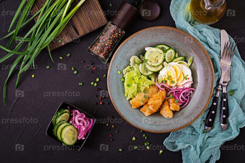 Салат из яиц, жареной рыбы и свежих овощей. Азиатская кухня. Вид сверху