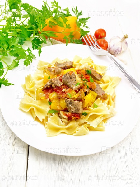 Фарфалле с индейкой и овощами на доске