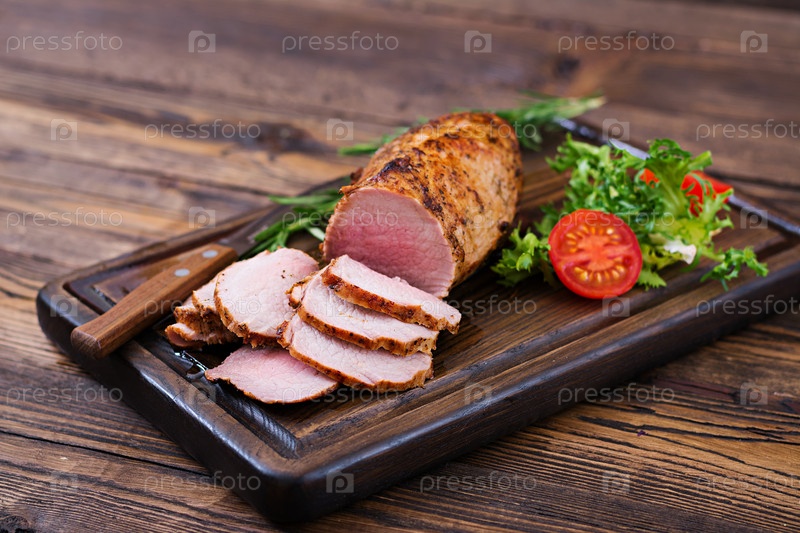Запеченная сочная телячья вырезка в специях на деревянном столе