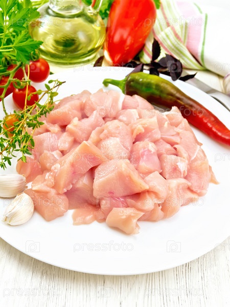 Куриная грудка сырая нарезанная в тарелке с овощами на светлой доске