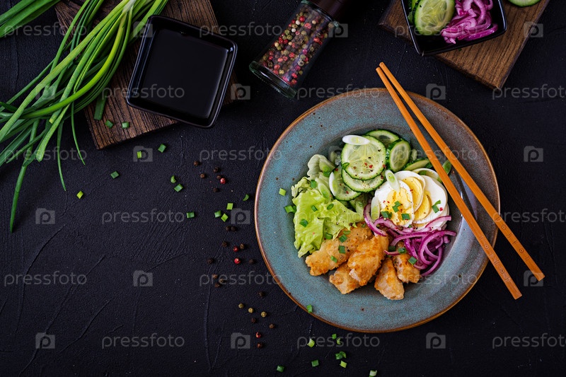 Салат из яиц, жареной рыбы и свежих овощей. Азиатская кухня. Вид сверху