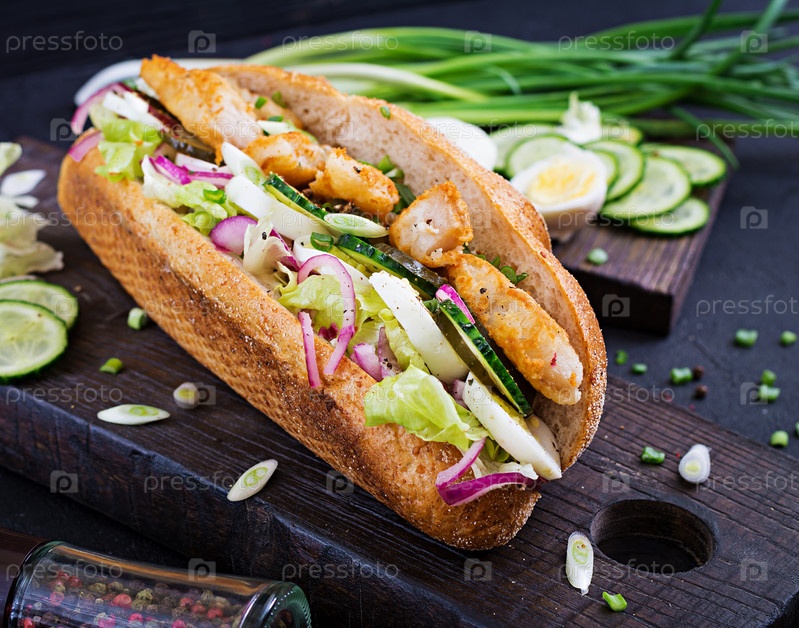 Багет-бутерброд с рыбой, яйцом, маринованным луком и листьями салата