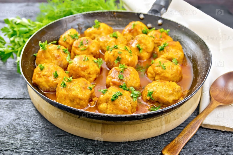 Тефтели в сковороде с салфеткой на черной доске