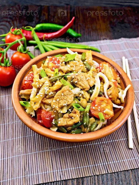 Лапша вок по-тайски в глиняной тарелке на доске