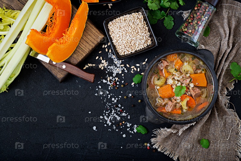 Густой суп с телятиной, перловкой, тыквой и сельдереем. Диетическое меню. Вид сверху